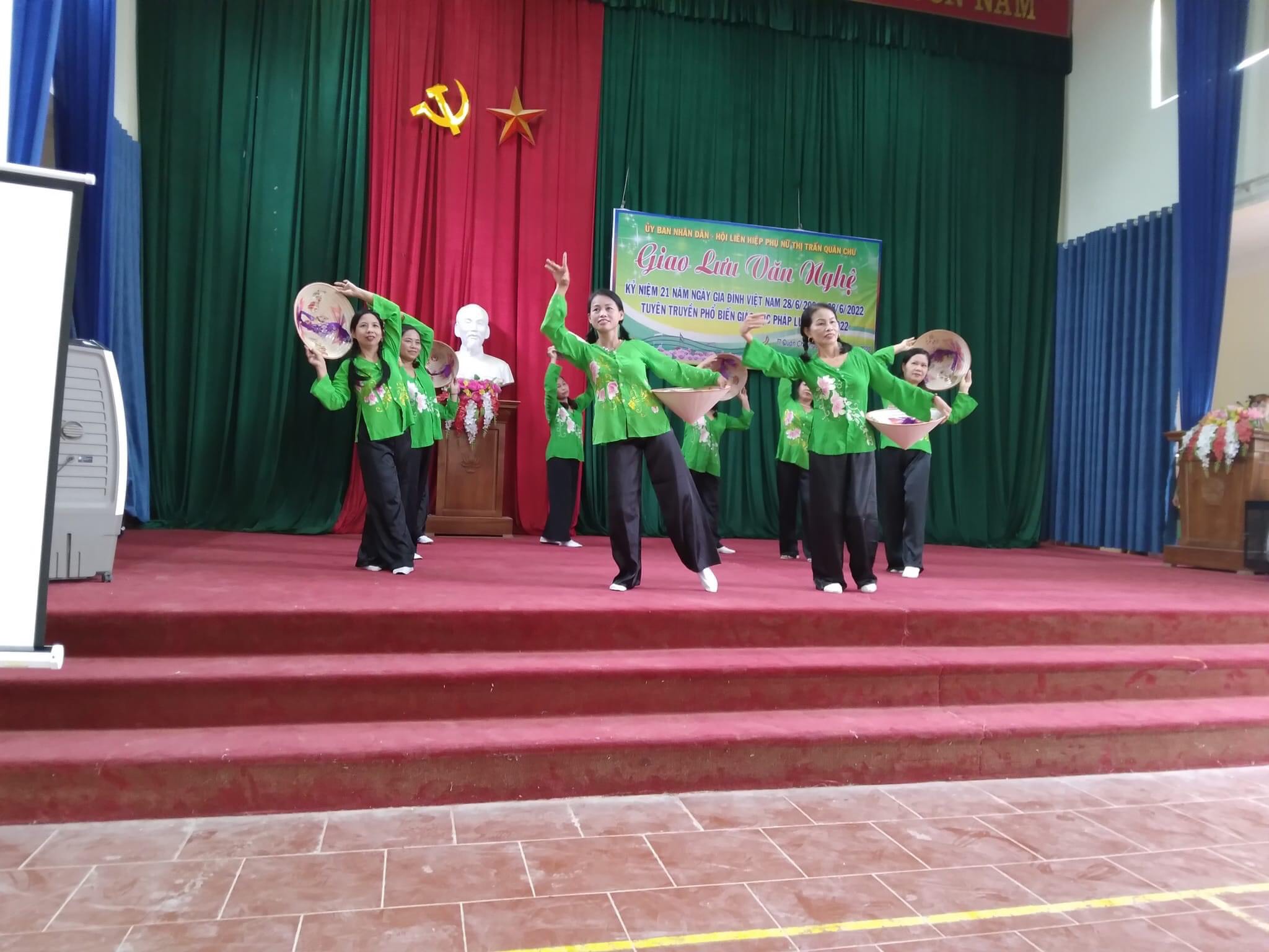 Ngày 22/6/2022 UBND thị trấn Quân Chu phối hợp với Hội LHPN thị trấn Quân Chu tổ chức chương trình Giao lưu văn nghệ kỷ niệm 21 năm ngày Gia đình Việt Nam 28/6/2001 – 28/6/2022 và tuyên truyền phổ biến giáo dục pháp luật năm 2022 tại Hội trường Nhà văn hoá thị trấn.